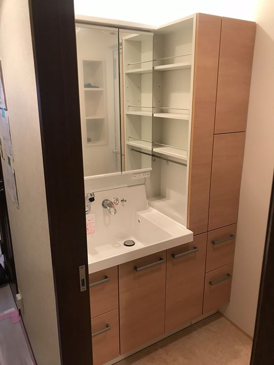 マンションの水回り改修工事を行いました。洗面化粧台はLIXILのサイドキャビネット付きのピアラ 洗濯機防水パン・混合水栓の洗濯水洗 トイレはLI...